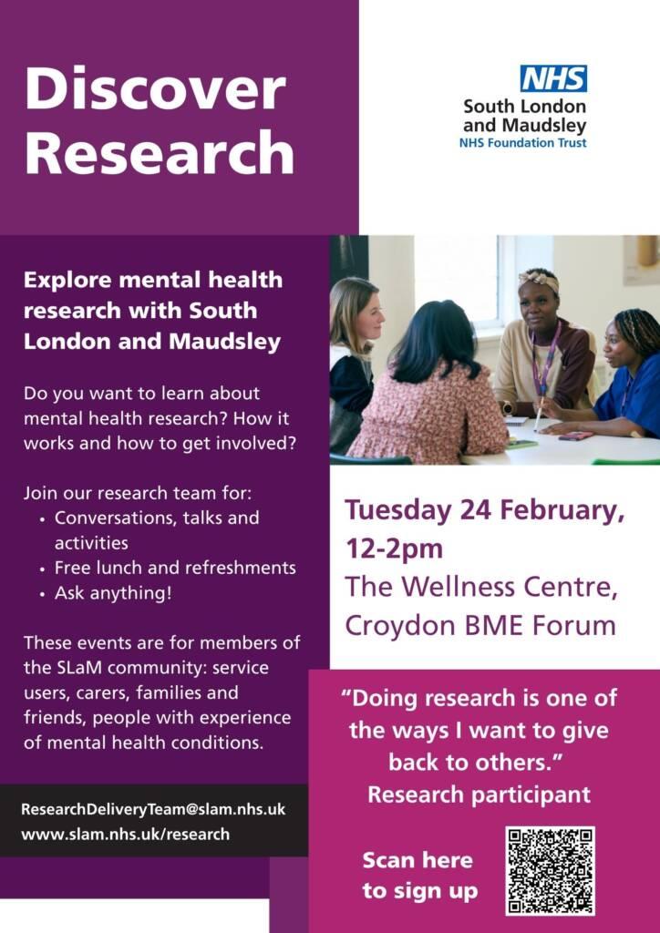 Discover Research at The Wellness Centre (Croydon BME Forum), Croydon Tuesday 24 February, 12-2pm