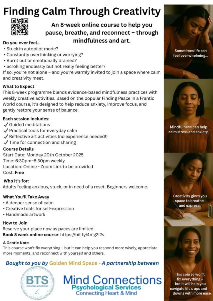 Do you feel caught up in autopilot, weighed down by stress or constant overthinking?Finding Calm Through Creativity is a gentle, supportive 8-week programme designed to help you step away from overwhelm, slow down, and reconnect — using simple mindfulness practices and creative art-making. No art skills needed!